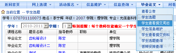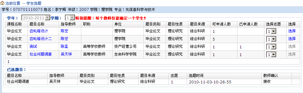 学生在题目的后面点击“选择”来完成选题操作,学生已选的题目在下面的列表栏显示,亦可点击后面的“退选”按钮退选该题目。同时学生还可通过查询教师的确认情况,“接收”表示同意,“拒绝”表示不同意。如果教师不同意,学生须另选题目。