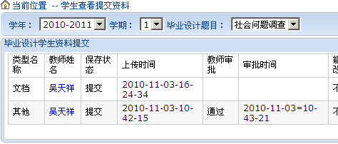 可进行学年、学期、毕业设计题目切换。选择文件后,进行资料上传、提交,同时可以查看教师的审核情况。、